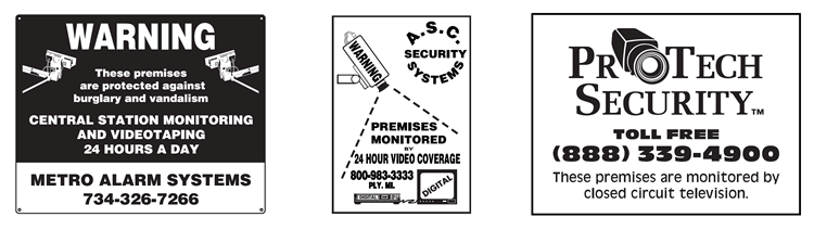 Perimeter or CCTV signs can be produced in any size up to 24" x 36". Materials available are .020, .024, .040 aluminum and .060 styrene plastic. Aluminum is available in reflective. They are screen printed with the same quality inks as our security signs. Aluminum signs are laminated with mylar. These signs have four 3/16" holes in the corners for mounting on chain link fences, walls or gates.